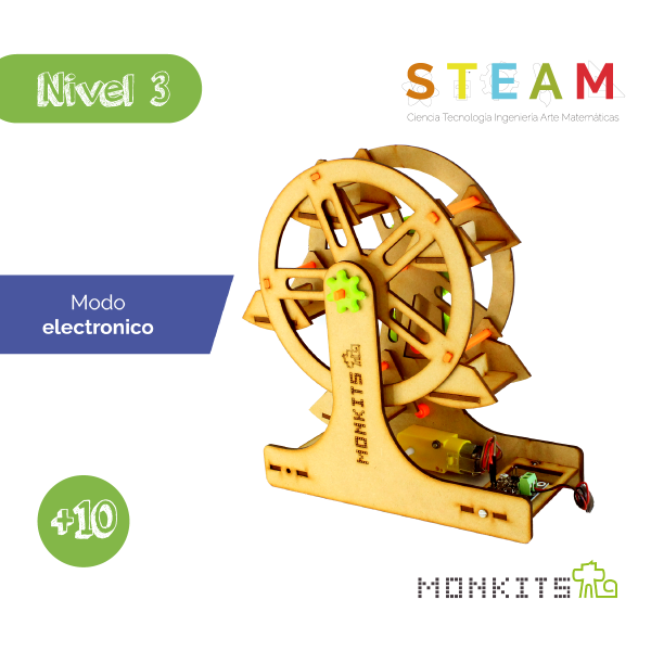 Kit didáctico para armar una Rueda de la Fortuna de MDF, con dos modos: Electrónico y Manual, aplicando el aprendizaje STEAM. La presentación de este kit es en bolsa.