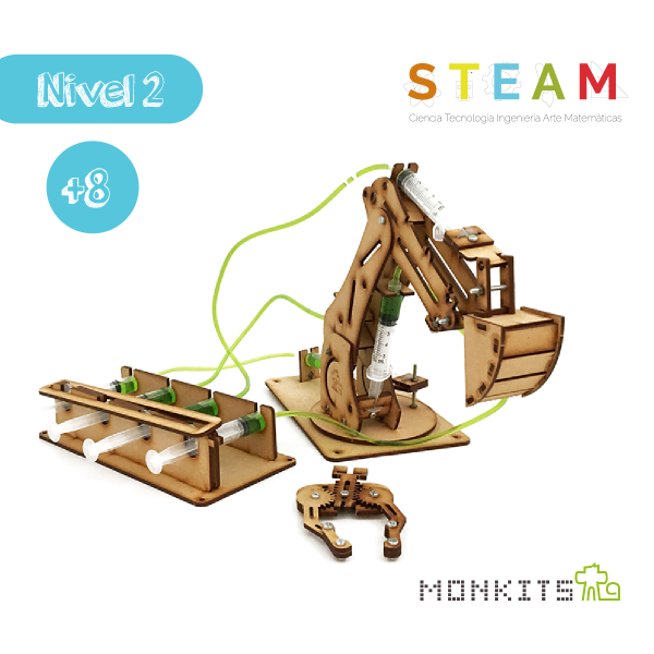 Kit didáctico para armar un Brazo Hidráulico de MDF, aplicando el aprendizaje STEAM. La presentación de este kit es en bolsa.
