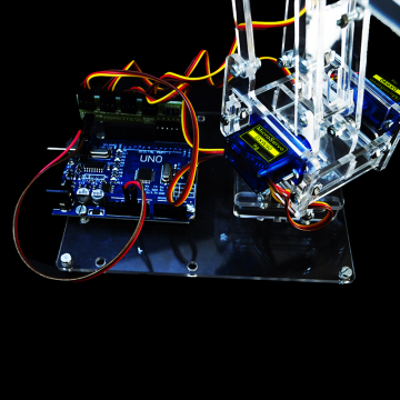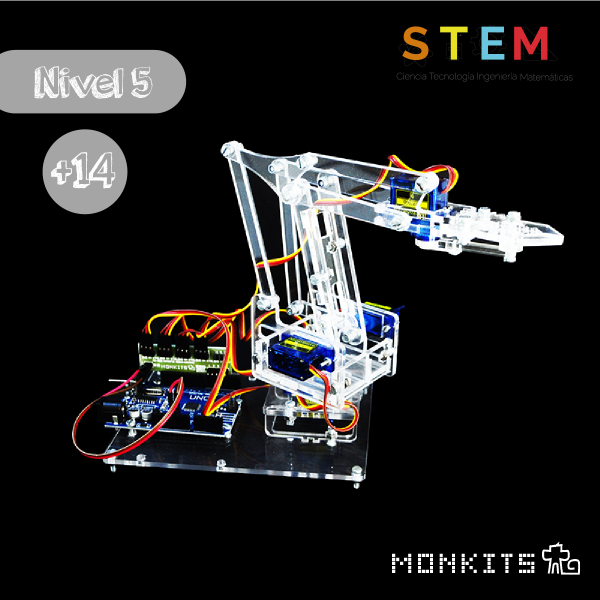 Brazo Robótico con Arduino (Acrílico), podrás armarlo y construirlo, aprenderás a controlar el movimiento mediante los servomotores. Con el podrás crear proyectos para divertirte. Descarga el código para Arduino IDF, para cargar una rutina de movimiento y una para controlar con potenciómetros.