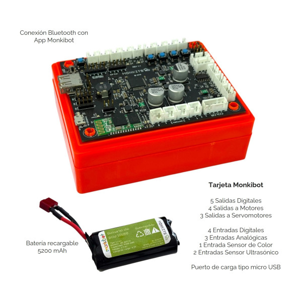 Monkibot es un juguete educativo con estímulo STEAM que permite al usuario interactuar de forma didáctica y divertida con principios básicos de mecánica y robótica, mediante prácticas que estimulan el desarrollo cognitivo en áreas de pensamiento lógico – matemático, basados en ensambles básicos, programación y creación de propios proyectos.