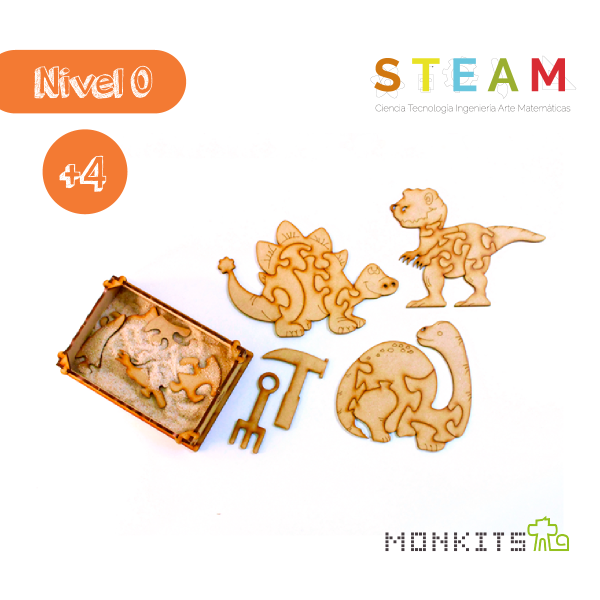 Kit didáctico económico rompecabezas dinosaurios 2D de MDF, aplicando el aprendizaje STEAM. La presentación de este kit es en bolsa. Caja para armar, acuarela y arena, incluidas.