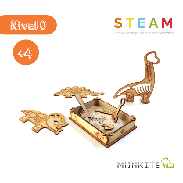 Kit didáctico económico rompecabezas dino-esqueletos de MDF, aplicando el aprendizaje STEAM. La presentación de este kit es en bolsa. Caja para armar, acuarela y arena, incluidas.