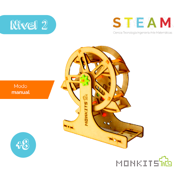 Kit didáctico para armar una Rueda de la Fortuna de MDF, aplicando el aprendizaje STEAM. No incluye caja de plástico, ni acuarelas (presentación en bolsa), este modo no es electrónico, es manual.