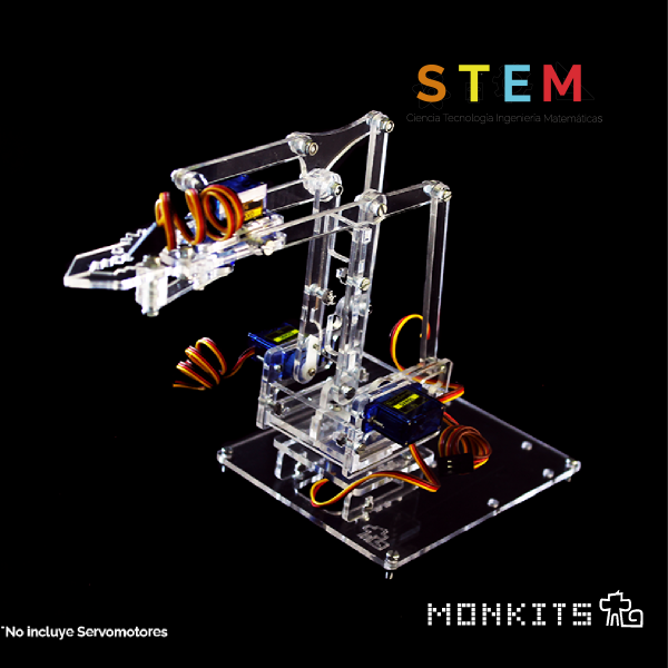 Estructura para armar Brazo Robótico en acrílico, podrás armarlo y construirlo, aprenderás a controlar el movimiento mediante los servomotores (No incluidos). Con el podrás crear proyectos para divertirte.